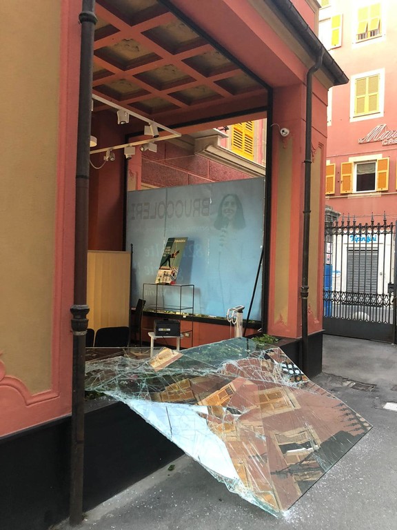 Distrutta la vetrata della Farmacia Sestri con un tombino