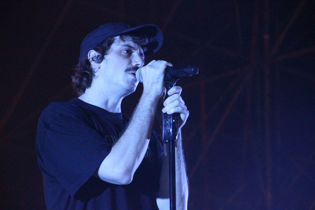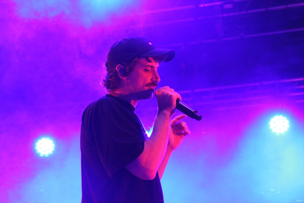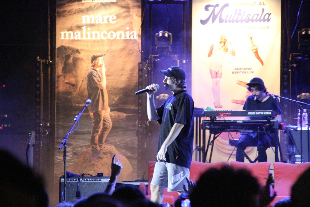 È poi Franco126 a chiudere le esibizioni sul palco principale. Di fronte alla Lanterna viene allestita una delle stanze di un Multisala d’epoca, con le poltrone rosse e le locandine illuminate, con l’insegna al neon sempre in bella vista. L’artista romano è ormai arrivato al suo secondo album solista dopo gli esordi insieme a Carl Brave.
