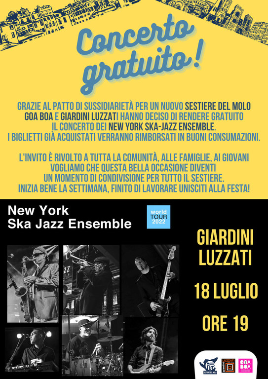 La New York Ska Jazz Ensemble arriva ai Giardini Luzzati questa sera, lunedì 18 luglio, alle ore 19, per un evento targato Goa Boa Festival.