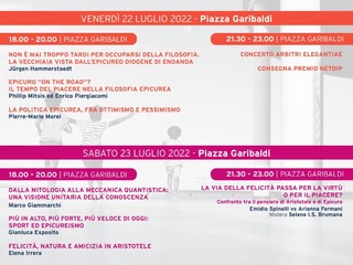 Uno sguardo internazionale sullo scenario della ricerca epicurea sarà dato dagli interventi di venerdì 22 luglio: alle 18, Jurgen Hammerstaedt, archeologo e professore di Filologia all’Università di Colonia, terrà un intervento dal titolo “Non è mai troppo tardi per occuparsi della filosofia”, in cui racconterà la vecchiaia vista dall’Epicureo Diogene di Enoanda. Prosegue Philip Mitsis, professore di studi classici greci alla New York University, insieme ad Enrico Piergiacomi, cultore di storia della filosofia antica presso l'Università degli Studi di Trento: insieme discuteranno di “Epicuro on the road? Il tempo del piacere nella filosofia epicurea”. L’ultimo monologo del pomeriggio sarà di Pier Marie Morel, professore di Storia della Filosofia antica alla Sorbona di Parigi che darà uno sguardo sulla politica: “La politica epicurea, fra ottimismo e pessimismo”.