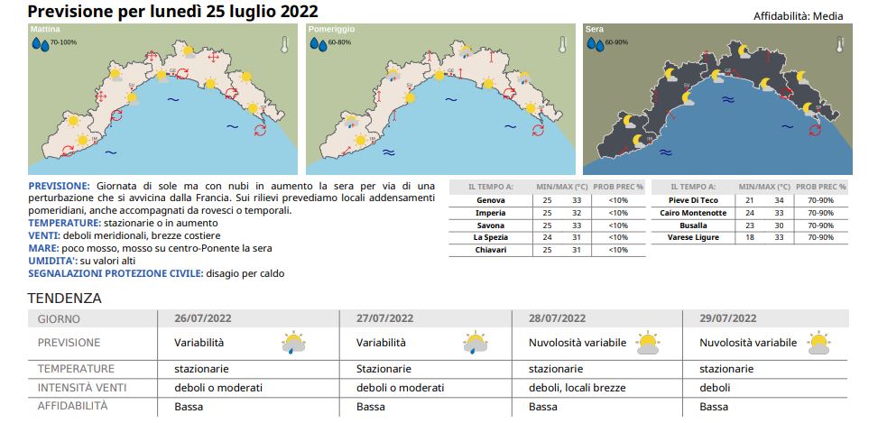 Continua il caldo che sta colpendo nelle ultime settimane la Liguria. Nella giornata di oggi, secondo le previsioni di Arpal è previsto sole ma con nubi in aumento la sera per via di una perturbazione che si avvicina dalla Francia.