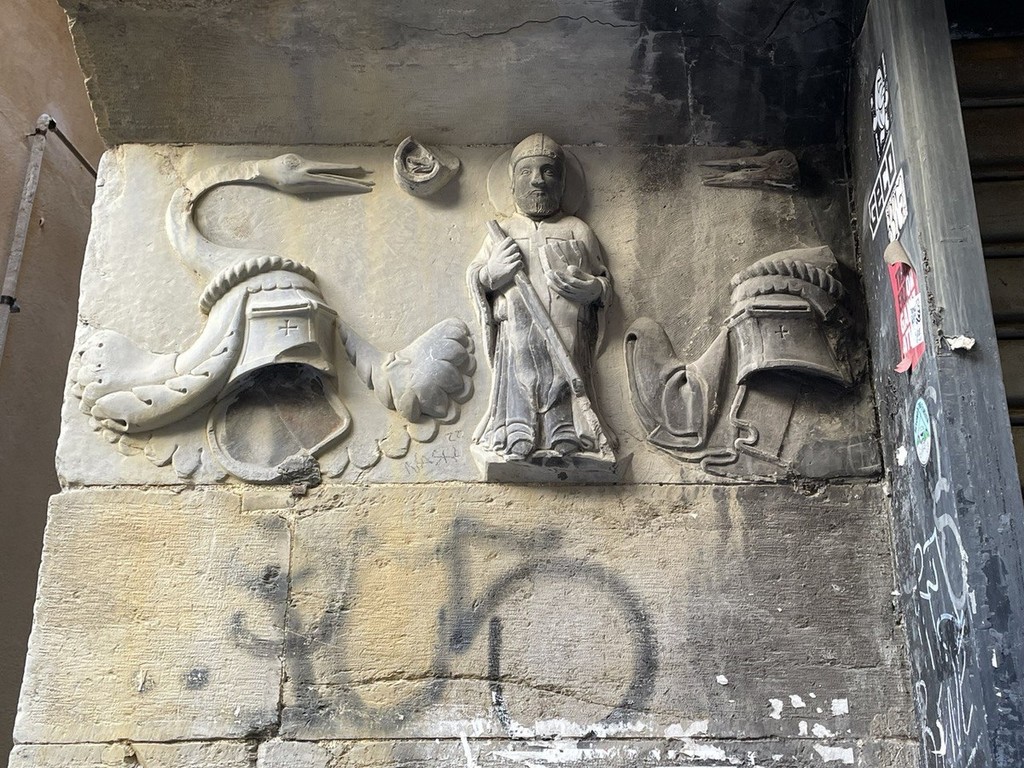 A pochissima distanza dalla chiesa di San Pietro in Banchi, lungo via San Pietro della Porta, si trova un bassorilievo che mostra un uomo con una mitria in testa mentre accanto ha due cigni.