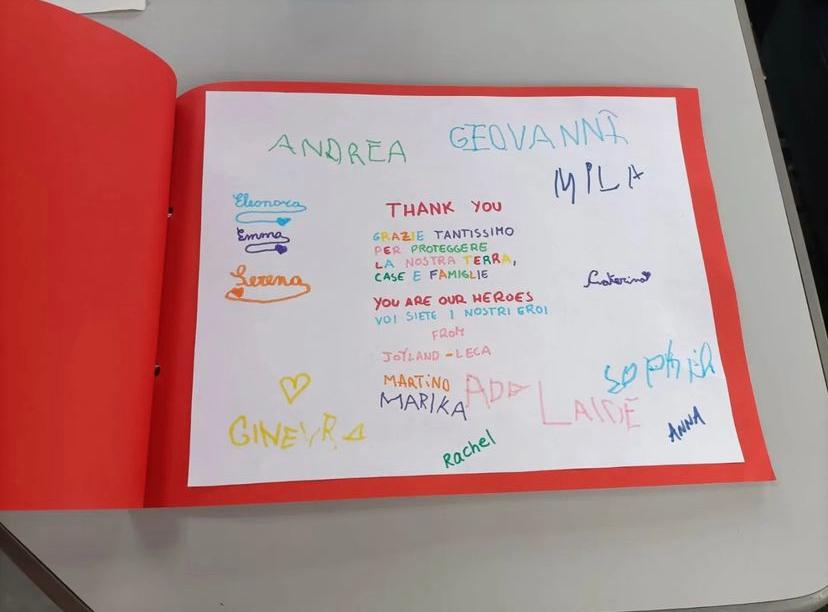“Grazie tantissimo per proteggere la nostra terra, case, famiglie. You are our heroes, voi siete i nostri eroi”: un messaggio “internazionale”, espresso in due lingue con tanti colori, quelli dell’arcobaleno, perché i piccoli sanno che tutte le forze impegnate in queste lunghissime giornate e nottate di lavoro faranno tornare il sereno.