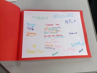 “Grazie tantissimo per proteggere la nostra terra, case, famiglie. You are our heroes, voi siete i nostri eroi”: un messaggio “internazionale”, espresso in due lingue con tanti colori, quelli dell’arcobaleno, perché i piccoli sanno che tutte le forze impegnate in queste lunghissime giornate e nottate di lavoro faranno tornare il sereno.