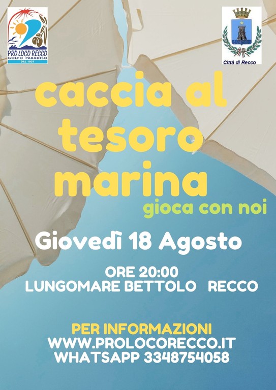 L’Associazione Turistica Pro Loco Recco con il Patrocinio del Comune di Recco, organizza il 18 Agosto 2022 una Caccia al Tesoro a tema marino aperta a bambini e ragazzi.