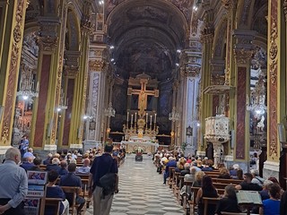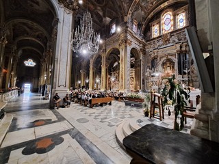 Le tre ampie navate della chiesa nel centro di Genova erano gremite. Sul feretro rose bianche e gialle: grande commozione al suo passaggio.
