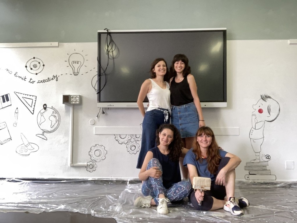Sono le professoresse a tempo determinato che, a giugno, hanno ritinteggiato e illustrato l’aula dell’istituto che ospita la lavagna multimediale.