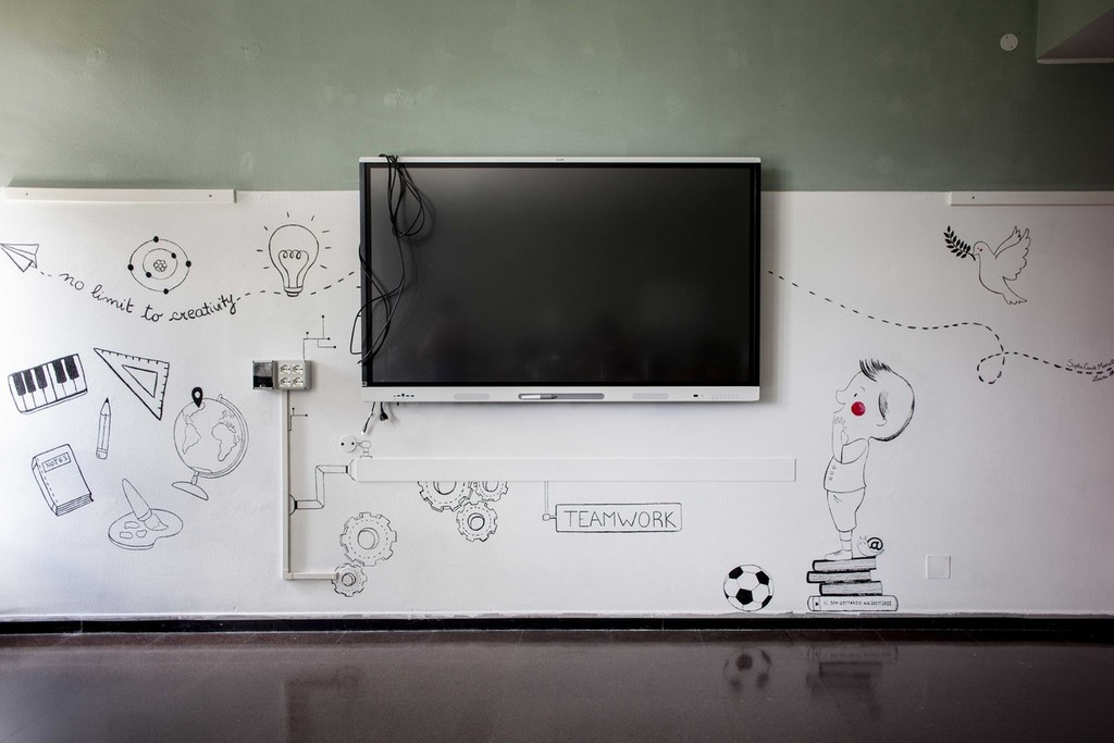 Nessun colore, se non per le guance del bambino e della colomba, evidenziate con il rosso, “scelta voluta per non mettere troppi elementi sulla parete. Al centro, la lavagna interattiva occupa parecchio spazio. Avessimo avuto a disposizione la parete per intero, ci sarebbe piaciuto farlo a colori. Gli oggetti, che da un lato rappresentano un impedimento, dialogano tra loro con il disegno stesso; il bambino che guarda la lavagna interattiva ne è un esempio. Il colore ci sembrava troppo”.