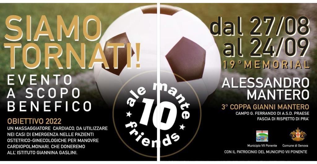 Gli anni 2020 e 2021 sono stati per gli AleMante Friends solamente un momentaneo stop, per ripartire ancora meglio, ancora più forti, ancora più determinati. Ed ecco allora che, finalmente, torna per la sua diciannovesima edizione il Memorial Alessandro Mantero (anche terza Coppa Gianni Mantero), un importante e assai partecipato tornei di calcio che interessa varie leve, che è sia maschile che femminile e che debutterà con il suo tabellone sabato 27 agosto al campo sportivo ‘G. Ferrando’, grazie all’ospitalità della Praese, per poi concludersi sabato 24 settembre con le finalissime. L’iniziativa gode del patrocinio del Municipio VII Ponente e vede impegnate le decine e decine di volontarie e di volontari che, rigorosamente con la maglietta degli AleMante Friends indosso, stanno preparando in questi giorni gli stand.
