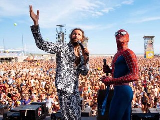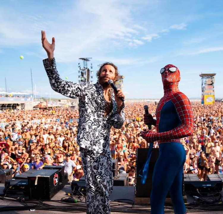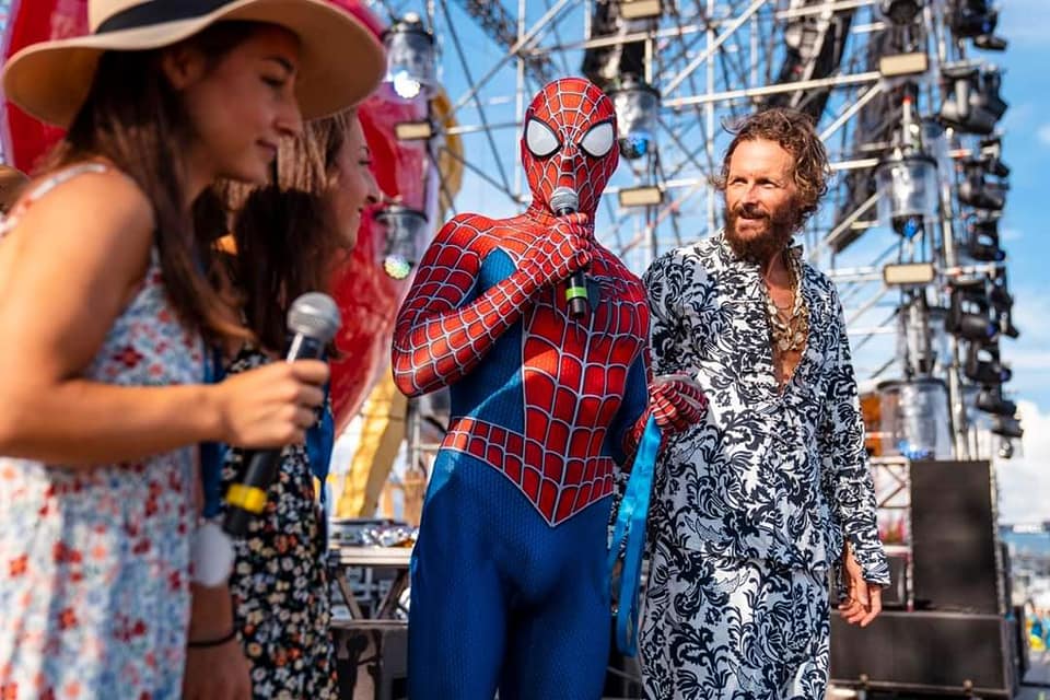 Mattia Villardita sul palco del Jova Beach Party. Lo Spiderman savonese è stato invitato per raccontare una storia di battaglia contro una grave malattia infantile.