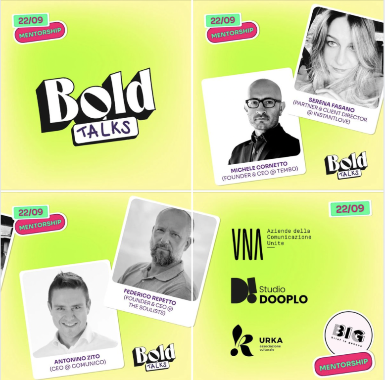 - Bold Talks, il primo programma di mentorship per studenti e giovani creativi del territorio ligure. Il 22/09 a partire dalle 11:00, i partecipanti potranno sedere in uno spazio safe e condividere un momento di orientamento con professionisti senior, associati UNA. Tra i mentori proposti, Michele Cornetto, Presidente delle unità territoriali di UNA, Serena Fasano, delegata territoriale Piemonte Valle D’Aosta UNA, Antonino Zito (CEO di Comunico) e Federico Repetto (CEO di The Soulists).