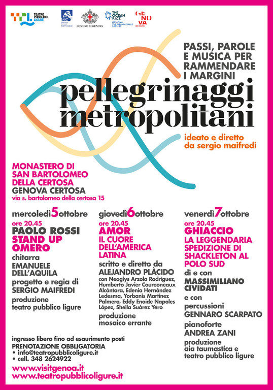 Il cammino di “Pellegrinaggi metropolitani. Passi parole e musica per rammendare i margini”, nuovo progetto di Teatro Pubblico Ligure ideato e diretto da Sergio Maifredi con il sostegno del Ministero della Cultura e del Comune di Genova, inizia al Monastero di San Bartolomeo della Certosa (via S. Bartolomeo della Certosa 15, Genova) con tre spettacoli. Mercoledì 5 ottobre va in scena Paolo Rossi con “Stand up Omero” (genere comico), giovedì 6 ottobre la compagnia di artisti cubani Havana Acrobatic Ensemble prosegue con “Amor. Il cuore dell’America Latina” di Alejandro Plàcido (teatro fisico acrobatico), venerdì 7 ottobre Massimiliano Cividati interpreta “Ghiaccio. La leggendaria spedizione di Shackleton al Polo Sud” (avventura, narrazione). Tutti e tre iniziano alle 20.45. Giovedì 6 ottobre è una giornata con doppio spettacolo: alle ore 17 l’Havana Acrobatic Ensemble fa “¡Fiesta! Uno spettacolo di circo cubano” (teatro fisico acrobatico) alla Chiesa di San Pietro di Pra’. Tutti gli appuntamenti sono a ingresso libero con prenotazione obbligatoria alla mail info@teatropubblicoligure.it o al cellulare 348 2624922. Informazioni e aggiornamenti su www.visitgenoa.it e www.teatropubblicoligure.it .