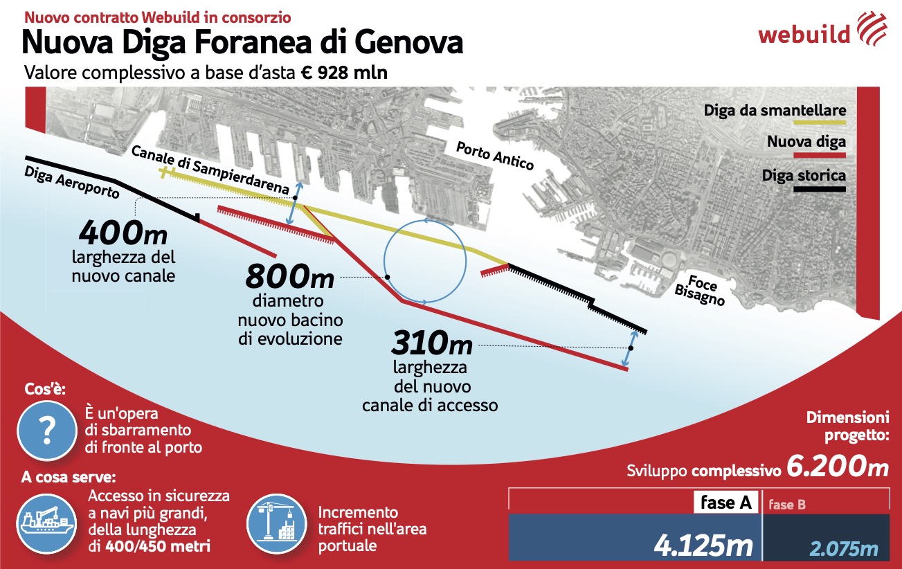 Commissionata dall’Autorità di Sistema Portuale del Mar Ligure Occidentale, l’opera rientra nel Programma straordinario per la ripresa del Porto di Genova, sarà cofinanziata dal Governo con risorse del Fondo complementare al PNRR e potrà beneficiare del Decreto Aiuti (D.L. 17 maggio 2022, n. 50). Il progetto prevede la realizzazione del nuovo sbarramento molto imponente a circa 450 metri oltre l’attuale diga foranea. Per la Fase A, attualmente finanziata, è previsto un basamento realizzato a 50 metri di profondità