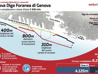 La Nuova Diga Foranea, spiega Webuild, è un’opera unica al mondo per la complessità ingegneristica, sia per le dimensioni che per la realizzazione “offshore”, cioè totalmente in mare aperto, senza che vengano interrotte le attività portuali. Poggerà su fondali a profondità variabile fino a 50 metri, la profondità maggiore al mondo mai sperimentata per una diga foranea, ed avrà uno sviluppo complessivo di 6,2 km, di cui poco più di 4 km inclusi nei cosiddetti lavori di Fase A.