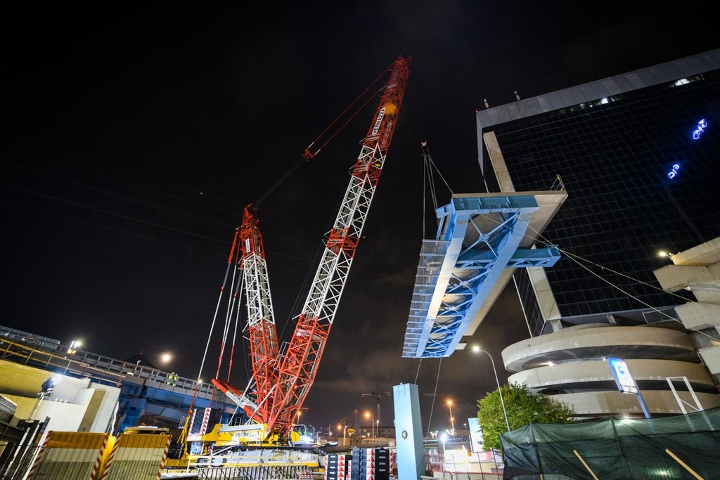 E’ stato sollevato e posizionatograzie a una gru cingolata DEMAG modello CC3800-1 con 60 metri di braccio euna portata di 650 tonnellate montata dall’impresa Vernazza per conto diAMPLIA S.p.A. e già utilizzata per la rimozione del vecchio cavalcaferrovianella notte di martedì 11 su mercoledì 12 ottobre.