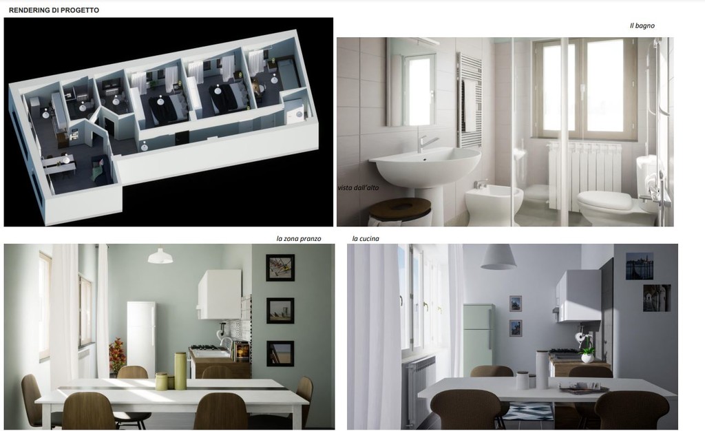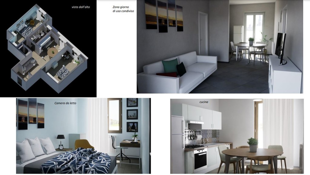 Nel dettaglio, per quanto riguarda l'immobile di vico Giannini, che ha una superficie utile di 90 metri quadri, il progetto firmato dall'architetto Cristina La Fauci prevede: la possibilità di utilizzare l’alloggio da parte di più famiglie che condividono la zona giorno. Con la ristrutturazione si ricava un secondo servizio igienico e, disponendo gli spazi in modo da consentire l’utilizzo da parte di una famiglia numerosa oppure di due famiglie più piccole che condividono uno spazio di cucina-soggiorno, si ricava un alloggio con ampie flessibilità d’uso.