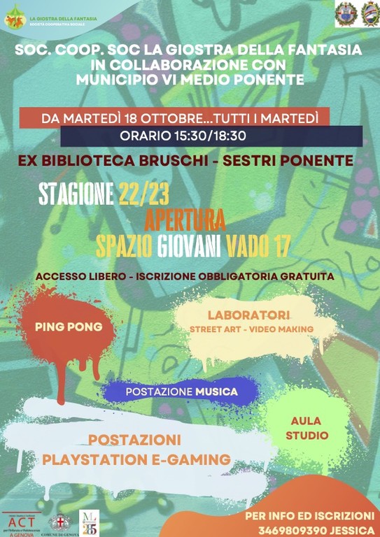 La Cooperativa La Giostra della Fantasia (da non confondere con l’Associazione che porta il suo stesso nome) è una delle realtà più importanti a livello di formazione e di educazione nel Ponente genovese ma non solo. Spetterà a queste ragazze e a questi ragazzi animare l’ex Biblioteca Bruschi: appuntamento da oggi e per tutti i martedì dalle 15,30 alle 18,30. Il luogo sarà denominato ‘Spazio Giovani Vado 17’ e la stagione 2022/2023, con accesso libero e iscrizione gratuita (ma obbligatoria), comprenderà tennis tavolo, laboratori di street art e video making, postazione musicale, postazioni per PlayStation ed e-gaming (dove verrà insegnato soprattutto come giocare consapevolmente) e aula studio.