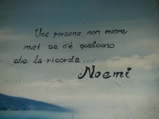 Ed ecco che, lo scorso 17 ottobre, in via 2 Dicembre, ovvero nella parte alta di Ca’ Nuova (zona conosciuta popolarmente anche come Cep) è comparso un murales con il ritratto di Noemj, il panorama di Napoli con il Vesuvio sullo sfondo (la bambina era innamoratissima di questa città, da cui proviene la sua famiglia, ed era anche molto tifosa del Napoli) e una scritta che solo a leggerla fa commuovere, per chi conosce la storia che c’è dietro (e anche un po’ per chi non la conosce): “Una persona non muore mai, se c’è qualcuno che la ricorda”. E poi, il nome di Noemj.