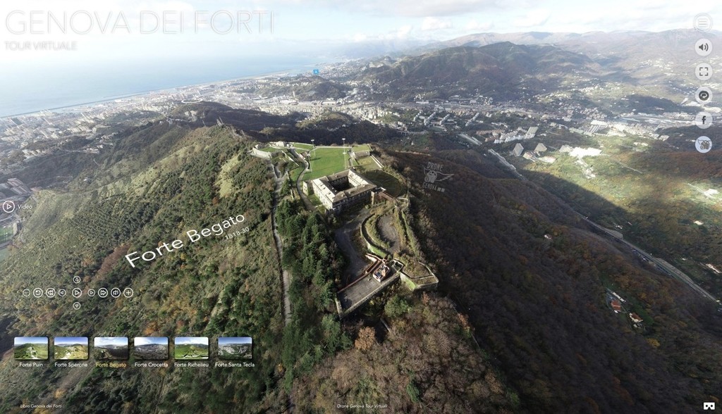 Una passeggiata virtuale tra i forti genovesi per catturare tutti i dettagli delle mura storiche che un tempo difendevano il territorio urbano e, nel frattempo, ammirare il panorama mozzafiato sulla città e sulla costa ligure. Drone Genova lancia il Tour virtuale aereo Forti di Genova, in cui è possibile esplorare a 360° i principali forti genovesi e osservarne da vicino le caratteristiche e le particolarità. Il tour è disponibile su www.cambiaprospettiva.com/360/tour-forti/ ed è un’evoluzione del libro fotografico “Genova dei Forti”, pubblicato nel 2015 da Sagep (www.droneliguria.com/genova-dei-forti/).