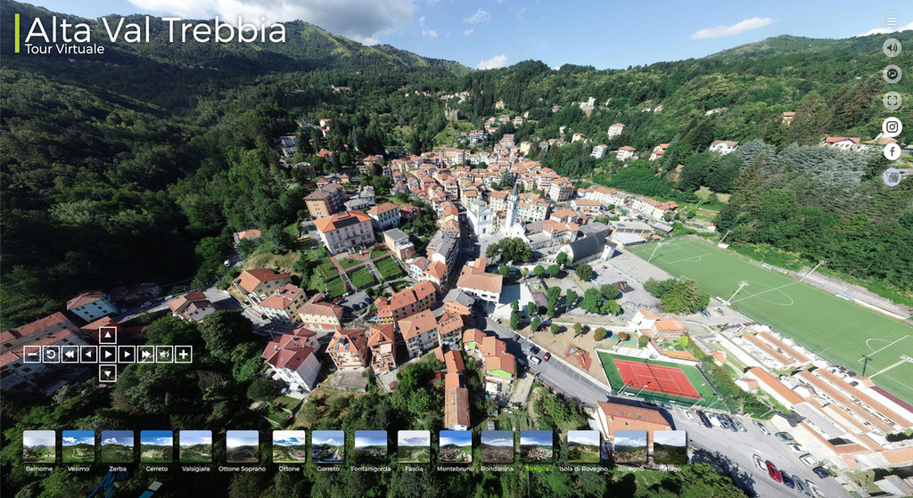 Tra le 20 località toccate dal tour, visitabile su www.cambiaprospettiva.com/360/tour-valtrebbia/, ci sono Fascia, Fontanigorda, Montebruno, Gorreto, Rondanina, Rovegno, Isola di Rovegno, Torriglia (provincia di Genova), Ottone, Ottone Soprano, Cerreto, Valsigiara, Belnome, Vesimo, Tartago e Zerba (provincia di Piacenza). Un viaggio aereo tra le bellezze e i panorami della splendida vallata attraversata dal fiume Trebbia, in cui il territorio incrocia 4 regioni e 4 province: Genova, Piacenza, Alessandria e Pavia