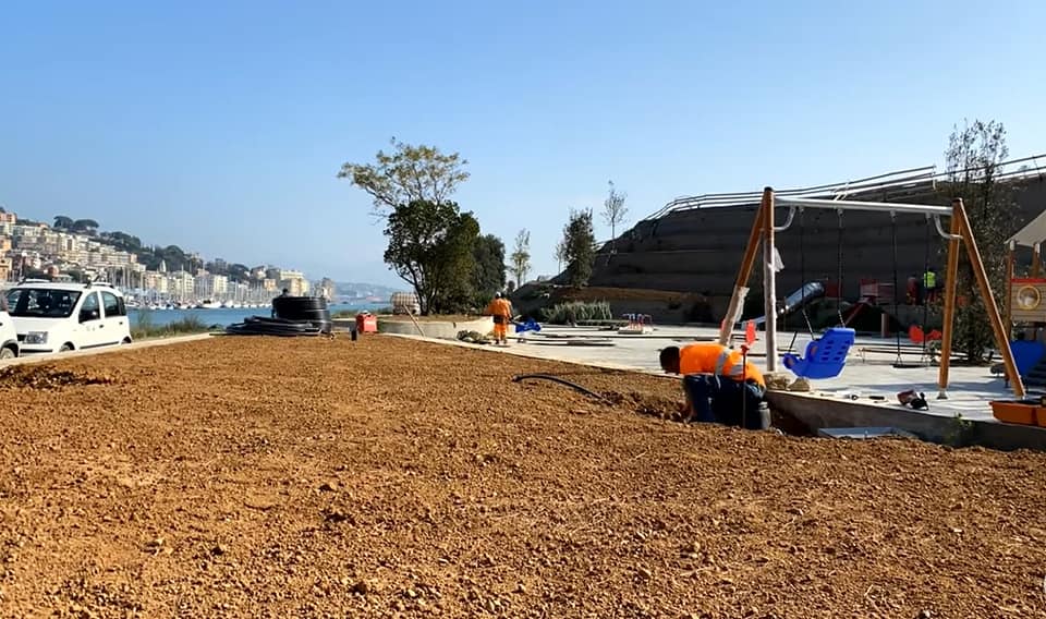 In parallelo è in conclusione la realizzazione della prima “baia” dedicata ai più piccoli con l’installazione delle ultime strutture per il gioco dei bambini e la predisposizione degli impianti di irrigazione e illuminazione.