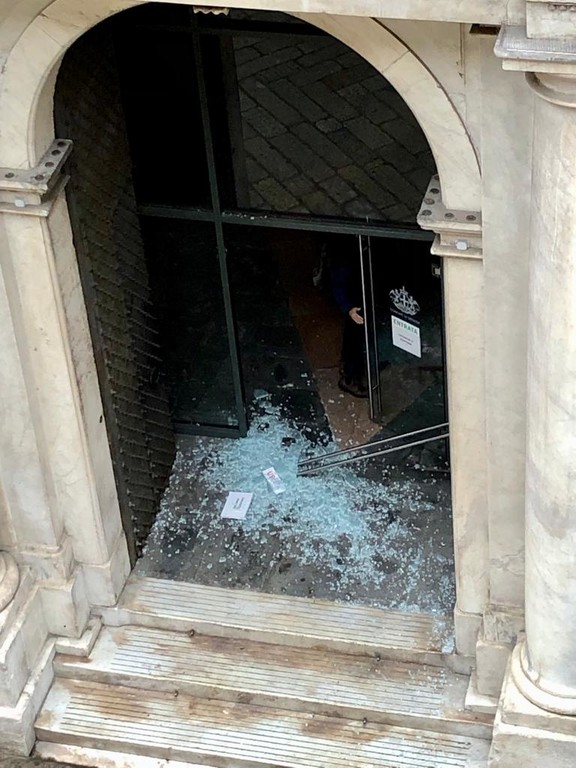 Maltempo, in frantumi la porta a vetri di Palazzo Tursi. Agente ferito (foto)