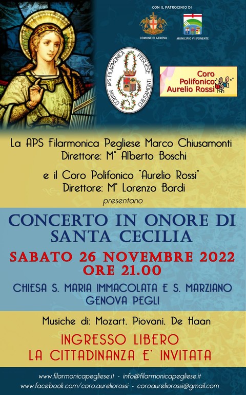 Santa Cecilia, che è stata celebrata lo scorso martedì, è da sempre la patrona dei musicisti e dei cantanti. Così non poteva non essere ricordata anche da chi, con e grazie alla musica, rende orgogliosa e fiera una delegazione. Ed ecco che la Filarmonica Pegliese Marco Chiusamonti ha organizzato un concerto in onore di Santa Cecilia: appuntamento sabato prossimo, 26 novembre, alle ore 21, presso la chiesa di Santa Maria Immacolata e San Marziano, dove tra l’altro il nuovo parroco, don Corrado Franzoia, è un bravissimo e appassionato musicista. L’ingresso è libero e la manifestazione è patrocinata dal Municipio VII Ponente.