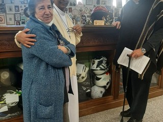 A ricevere l'omaggio creato dal vigile del fuoco Emanuele, Don Marco, suor Lina e la signora Anna responsabile dell'accoglienza.