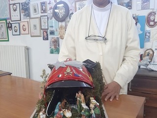 Per realizzarlo si è utilizzato un vecchio casco da capo squadra che è stato trasformato in grotta per ospitare le statuine della sacra famiglia.