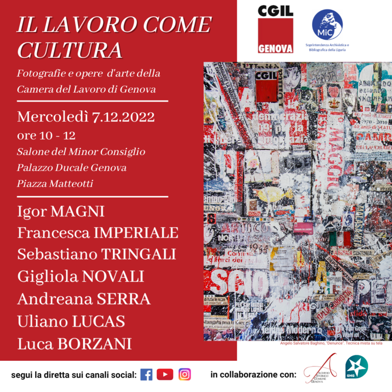 La giornata di studio vedrà gli interventi di: Igor Magni Segretario Generale Camera del Lavoro Metropolitana di Genova, Francesca Imperiale Dirigente Soprintendenza archivistica e bibliografica della Liguria, Andreana Serra Responsabile Archivio Storico del Comune, Sebastiano Tringali curatore del progetto “Il lavoro come cultura”, Gigliola Novali storica dell’arte e curatrice della Quadreria Cgil di Genova, Luca Borzani direttore de La Città, Uliano Lucas fotografo.