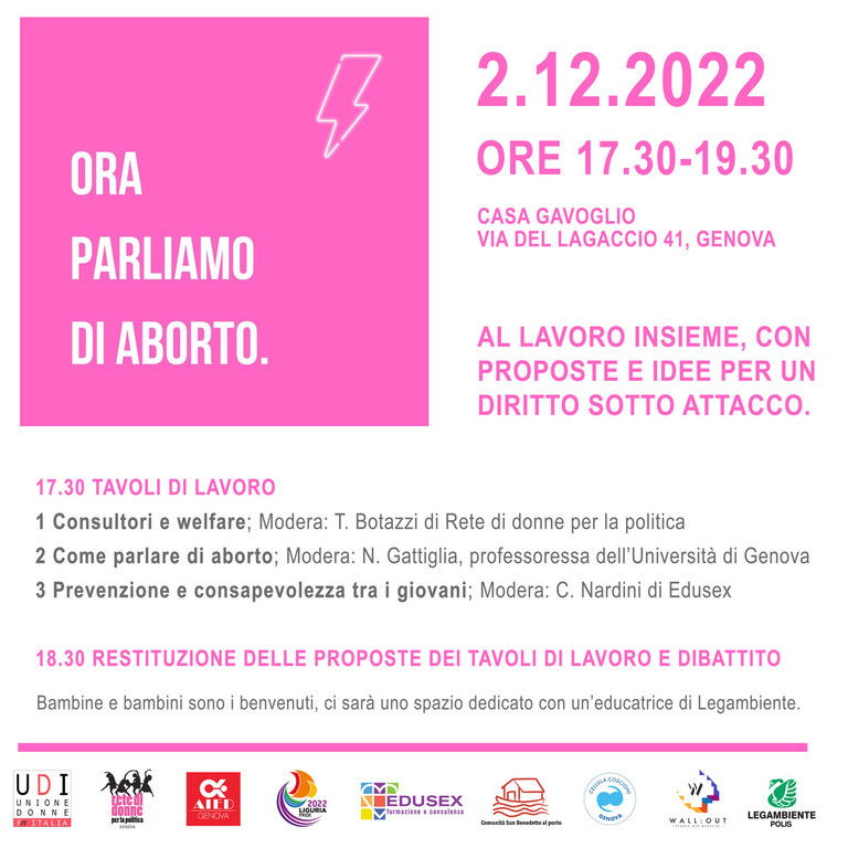 All’incontro “Ora parliamo di aborto. Al lavoro insieme, con proposte e idee per un diritto sotto attacco” parteciperanno un gruppo di persone che da anni, se non da decenni, si occupano del tema. UDI- Unione donne in Italia; AIED; Rete di Donne per la politica; Liguria Pride; Edusex. L’evento è supportato dalla rivista online Wall:Out, dalla Cellula Coscioni Genova e dalla Comunità di San Benedetto al Porto.