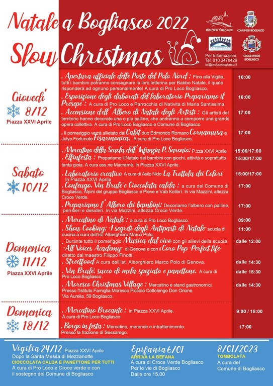 Dall'8 dicembre fino all'Epifania a Bogliasco ritorna il programma di feste ed eventi "Slow Christmas" con musica, tradizione, mercatini, l'ufficio postale di Babbo Natale per imbucare le letterine con i suoi elfi e poi ancora giochi per i piccoli, brulè e cioccolata calda della notte di Natale.