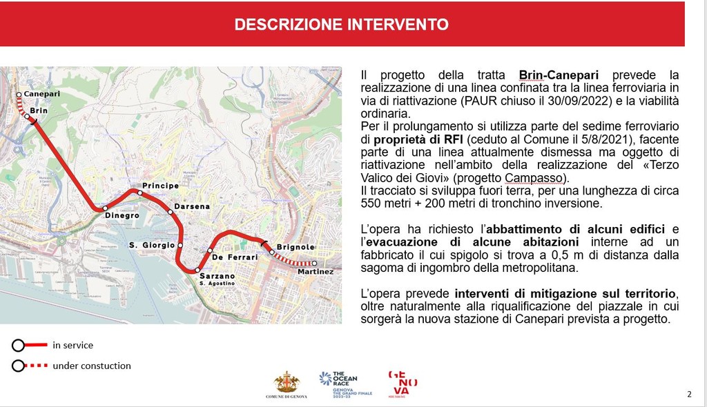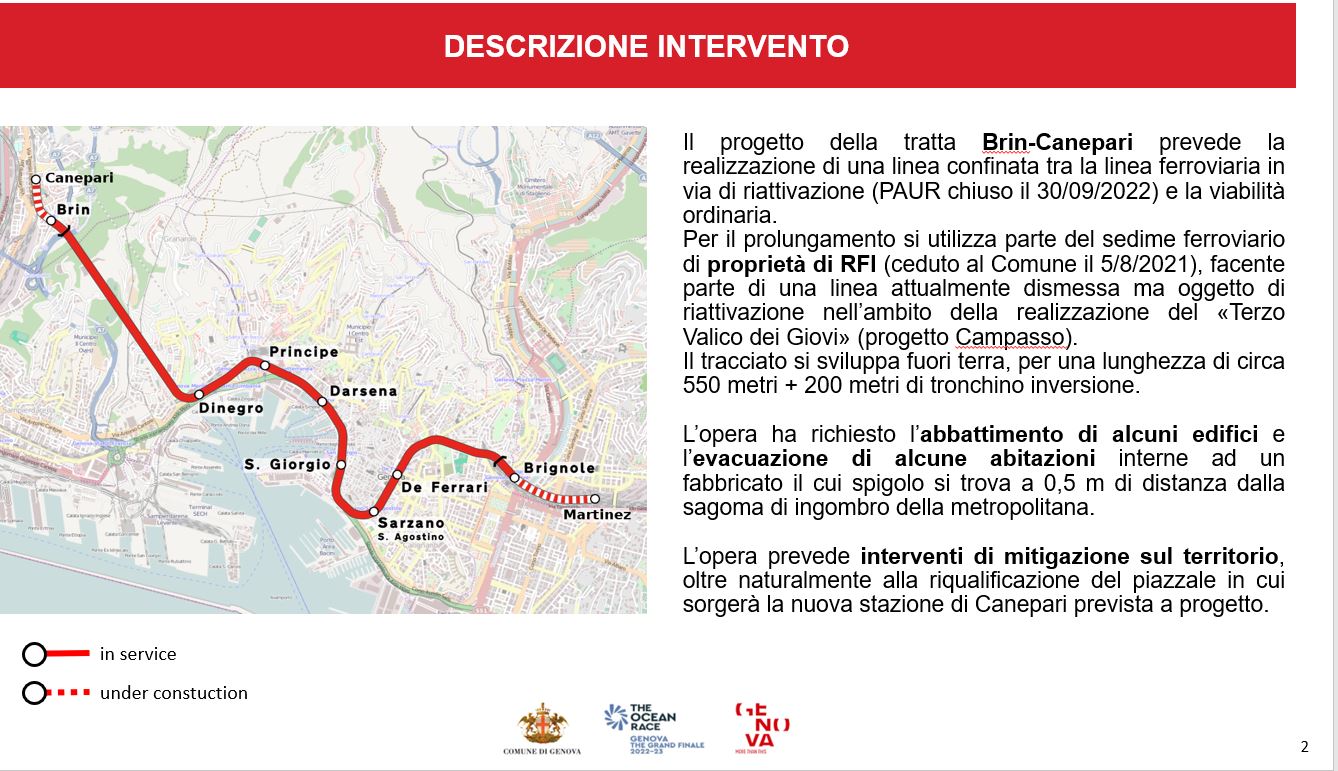 Il prolungamento della metro, finanziato dal governo Renzi, prevede lo stanziamento complessivo di 96 milioni, di cui il 60 per cento sul prolungamento della Valpolcevera e il 40 per il prolungamento della tratta Brignole-Martinez. La nuova tratta porterà a nuove stazioni e quattordici nuovi mezzi di trasporto. “Rappresenterà un miglioramento dell'offerta del trasporto pubblico locale in Valpolcevera”, ha commentato Campora che ha annunciato l'operatività della stazione a Canepari entro febbraio 2024.