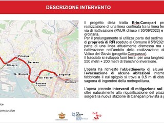 “Il progetto della tratta Brin-Canepari – si legge nella descrizione dell'intervento - prevede la realizzazione di una linea confinata tra la linea ferroviaria in via di riattivazione (PAUR chiuso il 30/09/2022) e la viabilità ordinaria.