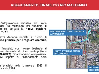 “L'opera concerne l'adeguamento idraulico del tratto tombinato di valle del Rio Maltempo, nel quartiere di Certosa, nell'area in cui sorgerà la nuova stazione metropolitana di Canepari. La messa in sicurezza dell'area rispetto al rischio di esondazione è obiettivo primario per il regolare esercizio della metropolitana. L'intervento è stato finanziato con risorse destinate al prolungamento e potenziamento di linee metropolitane esistenti (DM n° 97 20/04/22).