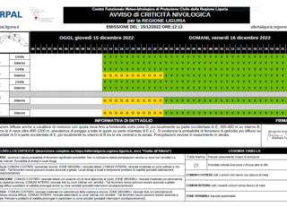 Arpal ha confermato la conclusione dell'allerta gialla per neve sui versanti padani di ponente (zona D), di levante (zona E) e per i comuni interni del centro regione (zona B) alle 24 di oggi, giovedì 15 dicembre.