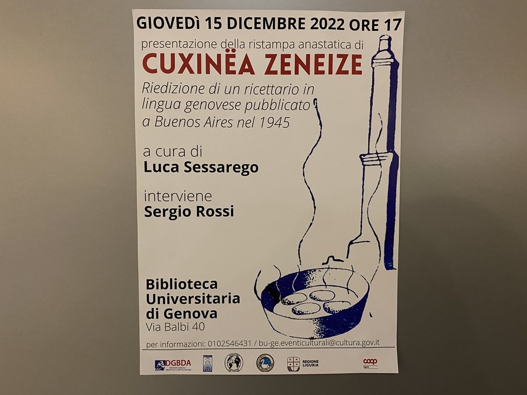 La ristampa anastatica del volume è stata presentata ieri pomeriggio alla Biblioteca Universitaria di Genova, alla presenza di Luca Sessarego e, in collegamento da remoto, del giornalista enogastronomico Pietro Sorba, Ambasciatore di Genova nel Mondo e residente a Buenos Aires.