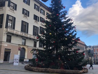 A causa del forte vento di ieri, la decorazione della punta dell'albero di Natale di piazza de Ferrari, si era spostata dalla sua posizione naturale rischiando di cadere.