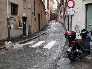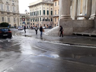 L'acqua ruscella copiosa da via Bellucci a piazza della Nunziata allagando piazza Bandiera, la strada è bloccata