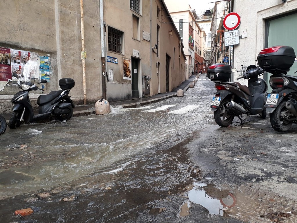 Esplode tubatura, via Bellucci allagata, cascate fino in piazza della Nunziata (video)