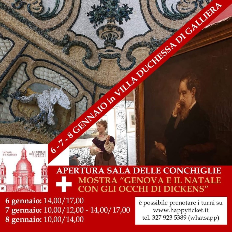 Le visite si possono prenotare a questo link: https://www.happyticket.it/genova/acquista-biglietti/233935-visita-sala-delle-conchiglie-mostra-dickens.htm, oppure al contatto WhatsApp 327 9235389. Gli orari: il 6 gennaio dalle 14 alle 17; il 7 gennaio dalle 10 alle 12 e dalle 14 alle 17; l’8 gennaio dalle 10 alle 14.