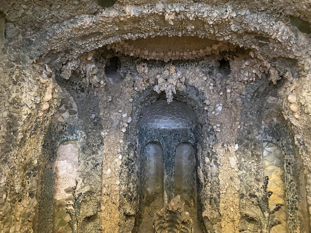 Le pareti sono rivestite di conchiglie di porcellana, tufo, serpentino e marmo bianco. Si intravedono poi inserti in rami di corallo e vetri tagliati sempre a forma di conchiglia. Realizzata attorno al 1780, la tradizione vuole che la decorazione sia da attribuire a Giuseppe Canepa (1721-1803), artista polimaterico, esperto quadraturista e artista che si ritrova spesso nei cantieri di Simone e Gaetano Cantone. È probabile che il progetto decorativo sia da attribuire proprio ai Cantone, anche se la forma delle conchiglie, la disposizione delle decorazioni rococò e molti altri segni distintivi sono simili, se non uguali, ad altri interventi sicuramente realizzati da Giuseppe Canepa.