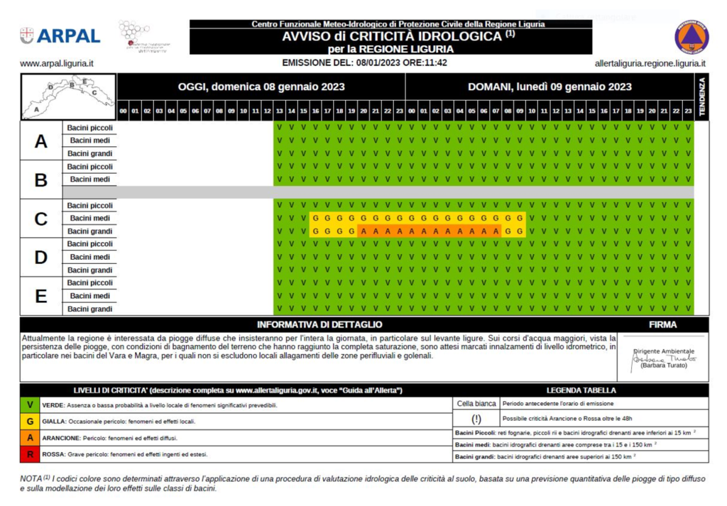 Nei bacini piccoli della zona C (per esempio a La Spezia) nessuna allerta.