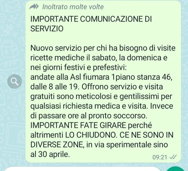 Nelle ultime ore molti genovesi hanno ricevuto un messaggio su WhatsApp che suggerisce di utilizzare un ‘nuovo servizio’ di visite gratuite alla Fiumare, con prescrizione di ricette mediche. Asl3 informa che si tratta di una fake news, smentendo integralmente quanto contenuto nel messaggio. L'autore del gesto è al momento sconosciuto.