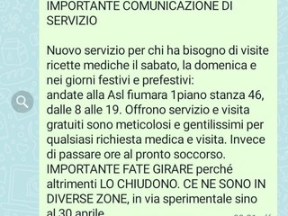 Nelle ultime ore molti genovesi hanno ricevuto un messaggio su WhatsApp che suggerisce di utilizzare un ‘nuovo servizio’ di visite gratuite alla Fiumare, con prescrizione di ricette mediche. Asl3 informa che si tratta di una fake news, smentendo integralmente quanto contenuto nel messaggio. L'autore del gesto è al momento sconosciuto.