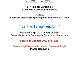 ‘Le truffe agli anziani’, titolo dell’iniziativa organizzata dall’Arma dei Carabinieri, dalle Associazioni d’Arma e dal Cup - Centro Universitario Pegliese con il patrocinio del Municipio VII Ponente. Relatore sarà il capitano dei Carabinieri Cristian Letizia, comandante della Compagnia dei Carabinieri di Arenzano. La cittadinanza è invitata e l’ingresso è libero. Previsto anche l’intervento di Massimo Licata, luogotenente della stazione dei Carabinieri di Pegli.