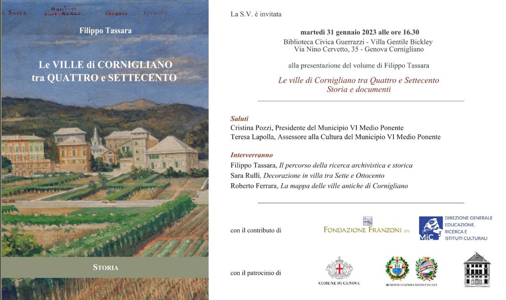 Sono previsti gli interventi di Filippo Tassara (‘Il percorso della ricerca archivistica e storica’), di Sara Rulli (‘Decorazione in villa tra Sette e Ottocento’), di Roberto Ferrara (‘La mappa delle ville antiche di Cornigliano’). L’ingresso è libero. A pubblicare il libro è la Fondazione Franzoni, mentre l’appuntamento di martedì è patrocinato dal Municipio VI Medio Ponente.