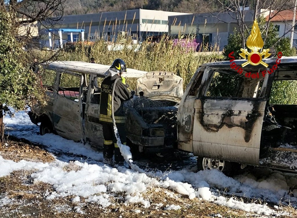 I mezzi si trovavano in un'officina per essere riparati. L'incendio è divampato in uno dei due furgoni, alimentato a Gpl, e le fiamme si sono poi estese all'altro