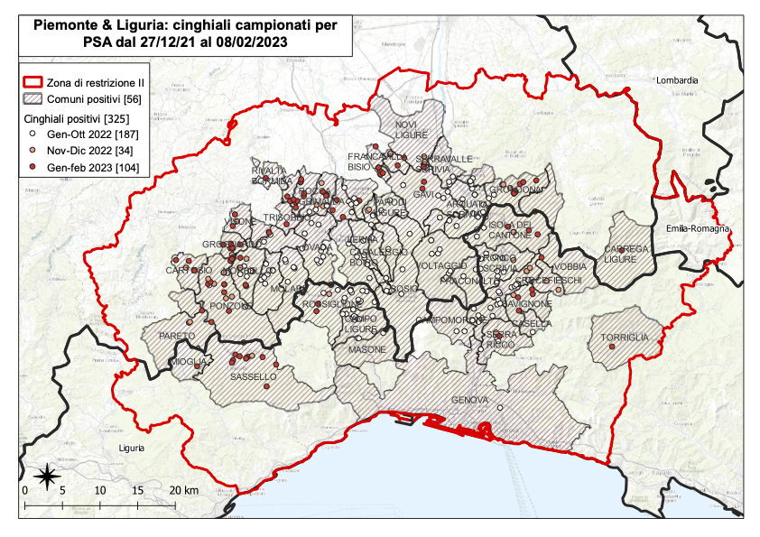 Con il caso di Torriglia salgono così a 56 i Comuni interessati in cui è stata osservata almeno una positività alla Peste Suina Africana.