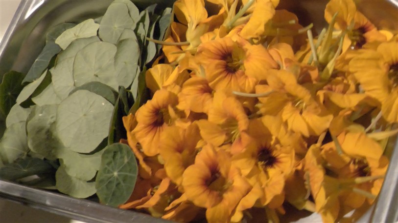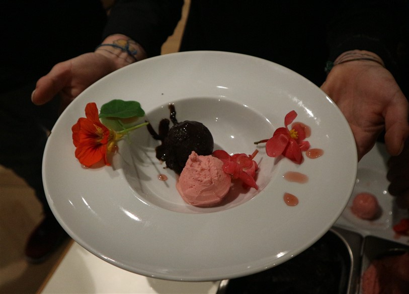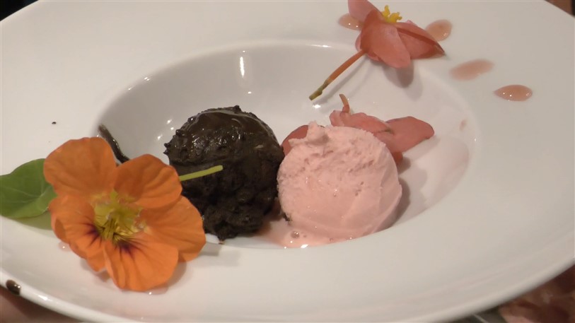 Sorbetto di Begonia e Sorbetto di cioccolato fondente Madagascar con Nasturzio e Pepe rosa